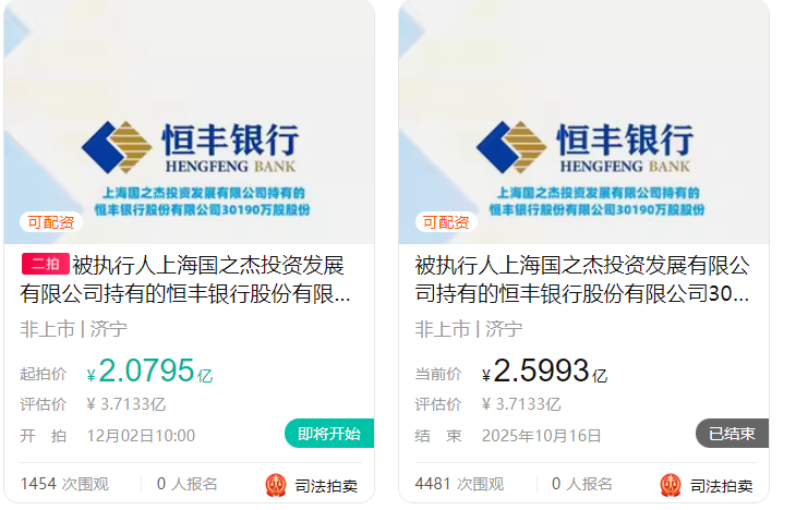 近日,阿里法拍网披露,上海国之杰投资发展有限公司(下称“上海国之杰”)持有的恒丰银行股份有限公司30190万股股份,将于2025年12月2日开始拍卖,起拍价2.0795亿元。此前,该笔股份起拍价为2.5993亿元。亦即:此次起拍价下降约0.52亿元。