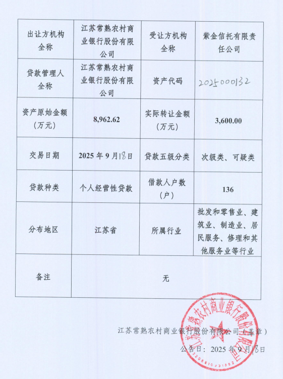转让近9000万不良资产。今年9月,常熟银行披露常兴惠2025年第一期不良资产转让公告,总金额8962.62万元,贷款种类是个人经营性贷款,涉及136户,债务人主要分布在江苏省等地区,涉及批发和零售业、建筑业、制造业、居民服务、修理和其他服务行业等,最终资金信托有限责任公司以3600万元受让该不良资产,约是资产原始金额的40%。
