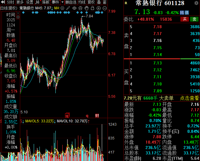 二级市场上,常熟银行股价总体呈现先降后升态势,年内高点7.84元/股(前复权,下同),此后开始了下跌之路,截至11月28日收盘,股价为7.13元/股,较点回调约9%,总市值236.5亿元,TTM市盈率5.64倍。