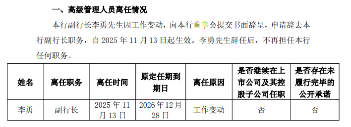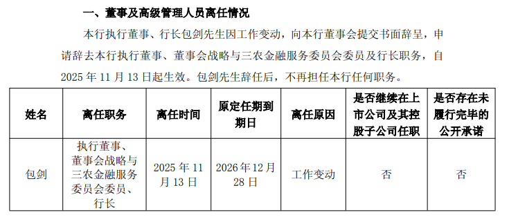 行长、副行长双双辞职。11月13日,常熟银行迎来重大人事变动,因工作变动原因,执行董事、行长包剑申请辞去公司执行董事、董事会战略与三农金融服务委员会委员及行长职务;副行长李勇同样因工作变动而辞职,两人离职后,将不在公司担任任何职务。