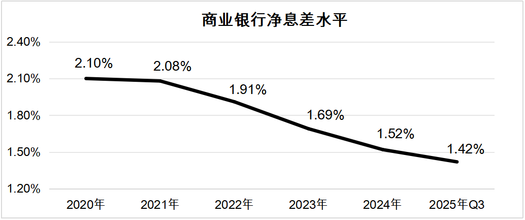 根据国家金融监管总局最新披露的数据,截至2025年三季度末,商业银行净息差1.42%,环比持平,同比收窄0.11个百分点。