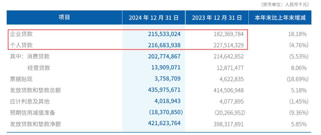 近年来,尽管微众银行有意从"个贷为王"向"个企并重"转型,但截至2024年末,个贷仍占有半壁江山。