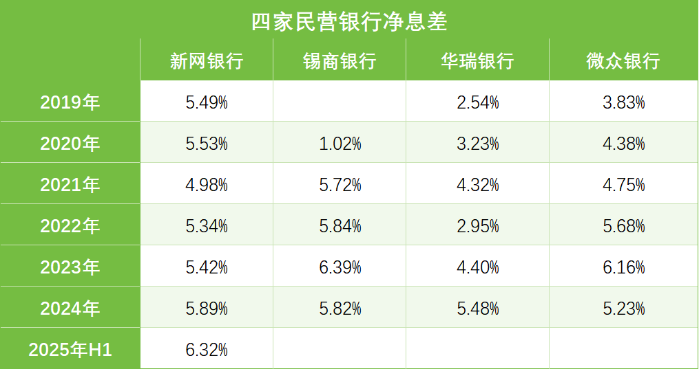 先看新网银行。2021年末-2024年末,该行的净息差从4.98%逐年提高到5.89%;企业预警通测算,2025年上半年末,新网银行的净息差突破“6”字头——6.32%。