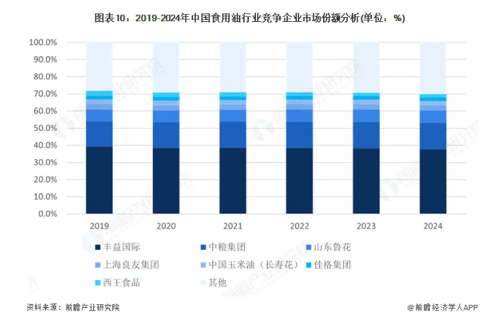 据前瞻产业研究院统计,2019年至2024年间,丰益国际(金龙鱼)在中国食用油市场的份额虽保持首位,但中粮集团份额从14.8%提至15.4%,山东鲁花等国内品牌也实现稳步增长。五年间,金龙鱼市占率不升反降,是否已触及成长天花板,值得企业反思审视。