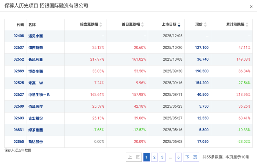 招银国际历史上作为保荐人参与了54个项目,其中暗盘有28家公司上涨,18家公司下跌,8家公司平盘,破发率33.33%。首日有34家公司上涨,12家公司下跌,8家公司平盘,破发率22.22%,整体胜率还行。今年以来参与了12个IPO项目,仅1个项目破发,并且还参与了中慧生物、吉宏股份、博雷顿等热点新股的保荐,项目的综合素质和保荐能力较过往均有明显提升。