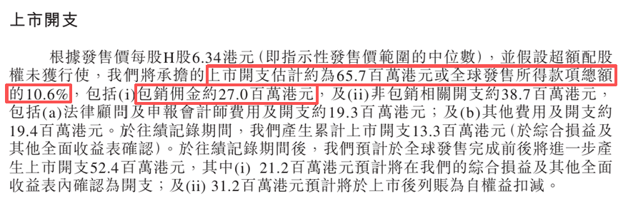 此次遇见小面IPO的开支总额估计约为6,570万港元,按发售价中值6.34港元计算,募资总额约6.17亿港元,开支占比约为10.6%。其中包销相关开支及费用2,700万港元,占比约为4.4%。