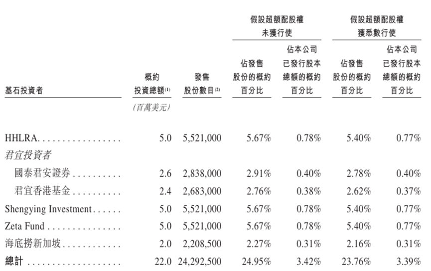 共有6名基石投资者:高瓴资本、君宜资本、国泰君安、晟盈投资、Zeta Fund、海底捞,合计认购0.22亿美元,按发售价上限7.04港元计算,相当于此次全球发售股份的24.95%及紧随全球发售完成后已发行总股份的3.42%(假设超额配股权未获行使)。