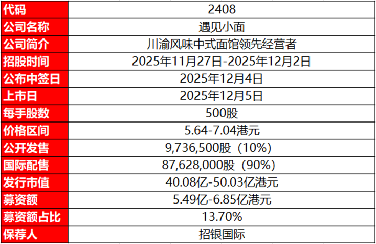 市场情绪层面,遇见小面招股时机一般,目前正与其他3只新股一起招股。虽然部分招股时间重叠,但是参与乐摩科技与金岩高新的资金能赶上遇见小面和天域半导体的末班车。本次公司采取机制B发行,公配固定10%,最多6,854万的货共19,473手,货量还行,一手入场费不到4,000元,参与的门槛也不高。但是隔壁的天域半导体公配有6万手,相比之下遇见小面的中签难度应该会更大,申购热度应该会更低,受到资金分流影响较大。不过遇见小面属于行业内稀缺标的,此次上市有望拿下中式面馆第一股的名号,在港股市场细分行业龙头标的的认可度和吸引力通常都不错。