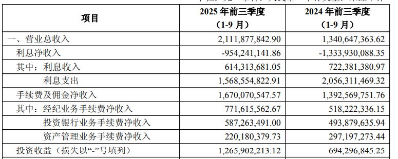 还以最新财报为例,2025年前三季手续费及佣金净收入16.70亿元,同比增长19.92%。其中,经纪业务手续费净收入7.72亿元,投行业务手续费净收入5.87亿元,同比均有增加,资管业务手续费净收入则小幅下滑,贡献2.20亿元;投资收益12.66亿元,同比增长82.33%,利息净收入也有可喜修复,但仍为负值,-9.54亿元。
