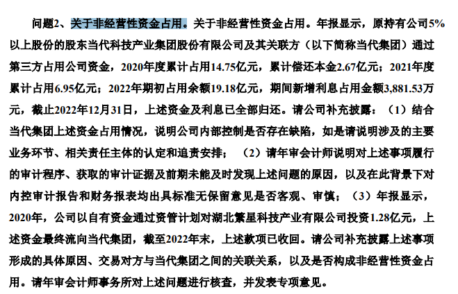 据公告及《工作函》,据天风证券2022年报显示,原持有公司5%以上股份的股东当代集团通过第三方占用公司资金,其中2020年累计占用14.75亿元,累计偿还本金2.67亿元;2021年累计占用6.95亿元;2022年期初占用余额19.18亿元,期间新增利息占用金额3881.53万元,截至2022年12月31日,上述资金及利息已全部归还;年报还显示2020年,天风证券以自有资金用过资管计划对繁星科技投资1.28亿元,该资金最终流向当代集团,截至2022年末该款项已收回。
