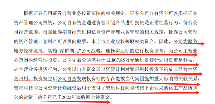 至于非经营性资金占用,天风证券认为向繁星科技投资是主营业务投资行为,不构成非经营性资金占用。在投资后公司自查时发现繁星科技将该融资款支付了当代旗下企业所拖欠的货款,因此于2022年末收回了该资金。同时强调,发现上述资金占用情况后,公司进一步加强了对关联方交易、资金支付、应收款项、资产安全等方面的管理,提高风险防范能力,切实保护公司资产安全。