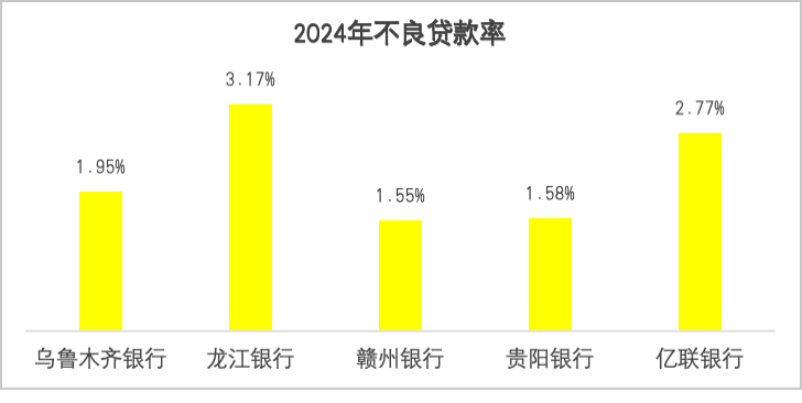 值得注意到,前文提到的乌鲁木齐银行、龙江银行、赣州银行、贵阳银行、亿联银行,本身不良贷款率都不低,2024年分别为1.95%、3.17%、1.55%、1.58%、2.77%。