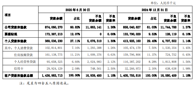 住房按揭贷款、个人经营性贷款、信用卡不良贷款分别为10.09亿元、20.25亿元、7.49亿元,较年初分别增加2.85亿元、2.11亿元、1.1亿元;不良贷款率分别为0.63%、2.12%、2.5%,较年初分别上升0.18个百分点、0.56个百分点、0.52个百分点。