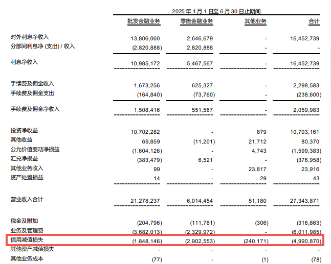 损失主要来源于以摊余成本计量的发放贷款和垫款,中报损失为58.32亿元,同比增加5.99亿元,增幅11.44%。进一步来看,批发金融业务、零售金融业务损失额分别为18.48亿元、29.03亿元,即损失主要来源于零售金融业务。