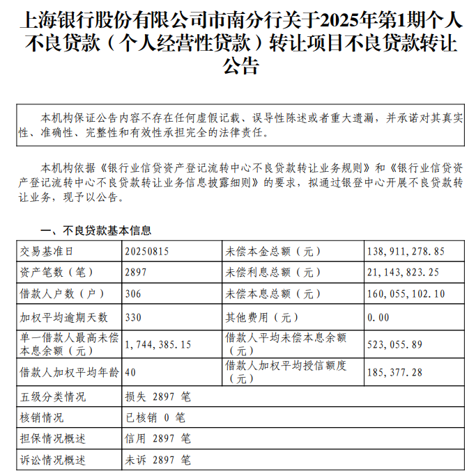 需要指出的是,公司也曾公开转让不良资产,今年9月,上海银行市南分行披露2025年第1期个人不良贷款(个人经营性贷款)转让公告,未偿本息总额1.6亿元,涉及资产笔数2897笔,借款人306户,全部为损失,拍卖起始价638.99万元,约是未偿本息总额的3.99%。
