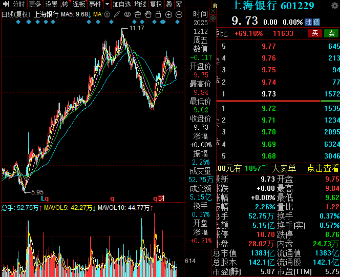 二级市场上,上海银行股价自2024年9月5.95元/股(前复权,下同)一路猛涨至11.17元/股的高点,随后下滑又反弹,截至12月12日收盘,股价为9.73元/股,较高点下滑约13%,总市值1383亿元,TTM市盈率仅5.75倍。