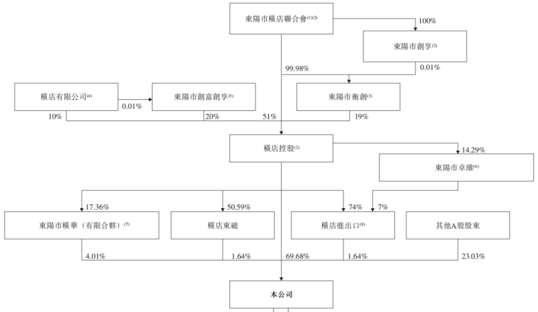 截至港股IPO前,公司的实际控制人为东阳市横店社团经济企业联合会,通过控股横店控股集团直接持有69.68%,且横店控股集团通过控股东阳市横华(有限合伙)、横店东磁、横店进出口持有相应南华期货股份。东阳市横华(有限合伙)持股4.01%;横店东磁持股1.64%;横店进出口持股1.64%;其他A股股东持股23.03%。