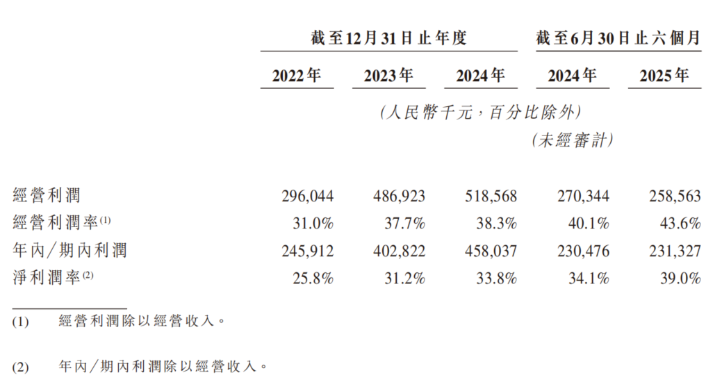 2022年至2025年上半年,公司的经营利润率分别为31.0%、37.7%、38.3%、43.6%,净利润分别为2.5亿元、4.0亿元、4.6亿元、2.3亿元,对应的净利率分别为25.8%、31.2%、33.8%、39.0%。