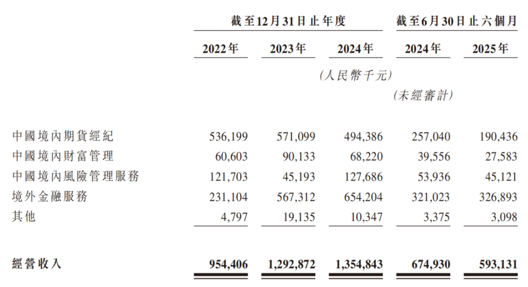 2022年至2025年上半年,公司经营收入分别为9.5亿元、12.9亿元、13.5亿元、5.9亿元。公司的四大业务为期货经纪业务、风险管理业务、财富管理业务和境外金融业务,其中境外金融服务和期货经纪为主要收入来源, 2024年营收占比分别为36.5%和48.3%。