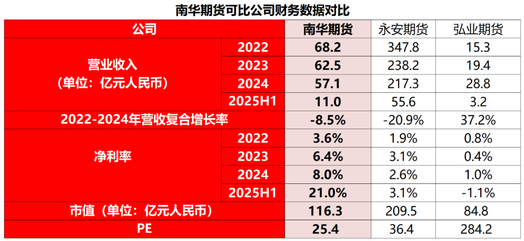 从营收看,南华期货和永安期货都有所下降,营收的年复合增长率均为负数,而反观弘业期货由于营收基数小的原因,近三年营收增速较快。前两者的营收规模下降与市场竞争加剧、行业佣金率下调等原因密不可分。三家公司2025年上半年的营收明显下降,以及南华期货营收与港股招股书中不一致,是由于公司过往采用总额法确认收入,而根据中期协2024年11月15日发布的《期货风险管理公司大宗商品风险管理业务管理规则》,自2025年1月1日起对同一交易日内签署采购和销售合同等六大类贸易类业务采用净额法确认收入。该调整仅影响财务报表中营业收入及营业支出的列示口径,对业务的盈亏没有影响。从利润角度看,南华期货2022-2024年净利率较上一年均有一定幅度提高,这得益于公司多元化的业务线及不断扩大的国内及国际版图,使得公司可以战略性分配资源,将会回报最大化。而永安期货和弘业期货的净利率都有所波动,可能是业务结构的调整和成本费用控制的影响。从估值上看,根据发稿日收盘的三家公司A股最新总市值,以及2024年末净利润进行估值。南华期货的估值倍数均低于另外两家,弘业期货由于其净利润基数较低,导致估值数据较大,为284.2X,南华期货和永安期货的PE为36.4X和41.4X。综合竞争力上看,南华期货业务多元,境外业务和盈利能力表现亮眼,差异化优势让其在市场有竞争力;永安期货是行业老牌龙头,业务布局广、客户资源多,规模和品牌优势突出,不过近年营收和净利率波动,仍靠综合实力稳站第一梯队;弘业期货营收增速猛,风险管理业务冲劲足,但盈利弱、稳定性差,还得补短板才能真正打硬仗。三家对比,永安期货当前竞争力较强,南华期货靠多元化业务线,弘业期货得加速补能,才能在期货赛道站稳。
