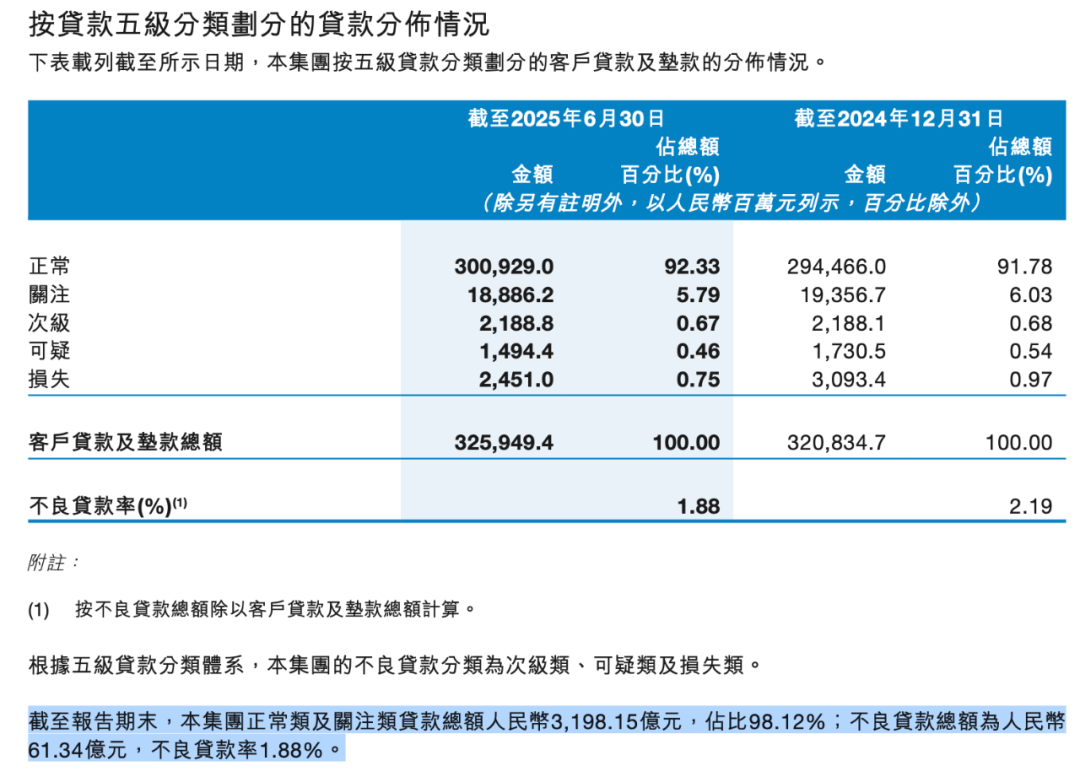 截至2025年6月30日,九江银行的不良贷款总额为61.34亿元,不良贷款率为1.88%,虽然较2024年末的2.19%有所改善,但仍需密切关注其迁徙趋势。特别是关注类贷款占比为5.79%,这类贷款虽然尚未划入不良,但已经出现了一些潜在风险信号。