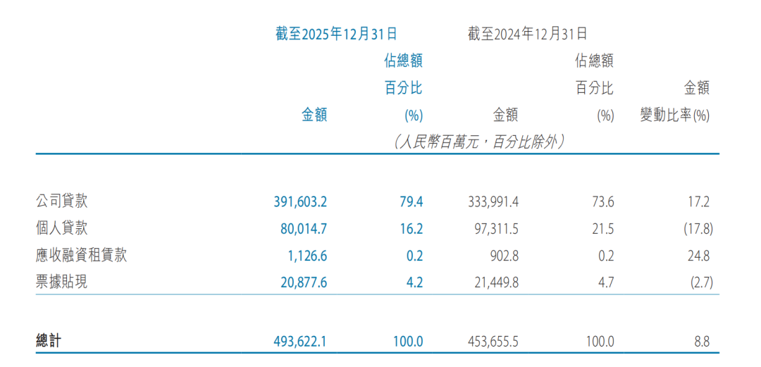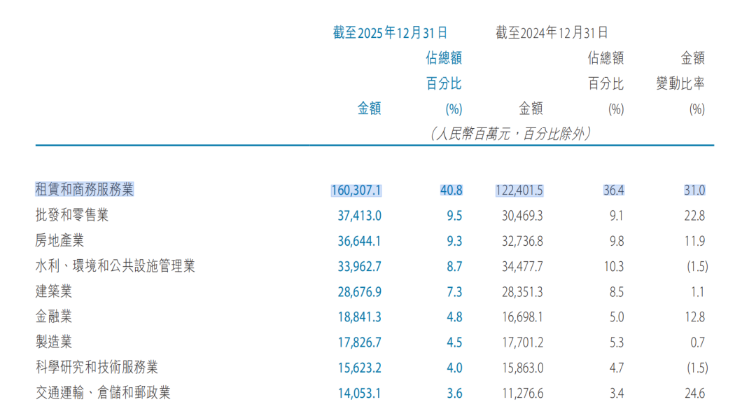 而面对个贷方面的收缩,天津银行则选择了将贷款投向了租赁与商业服务业,财报数据显示,2025年,天津银行在租赁与商业服务业的贷款金额达到1603亿元,较上年末大幅增加31%,同时这也是天津银行公司贷款中占比最高的行业,占比高达40.8%。