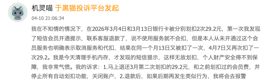 部分投诉则证实,嗨麦科技的“花招”被戳破后,并不会就此收手。比如,有投诉人反映,自己在3月4日被嗨麦科技无故扣款29.2元,他发现后要求全额退款并取消服务关闭代扣,嗨麦科技同意了。然而,他在清理手机内存时,却又发现了短信提示,原来3月13日、4月7日,嗨麦科技又故伎重演,悄悄划扣。
