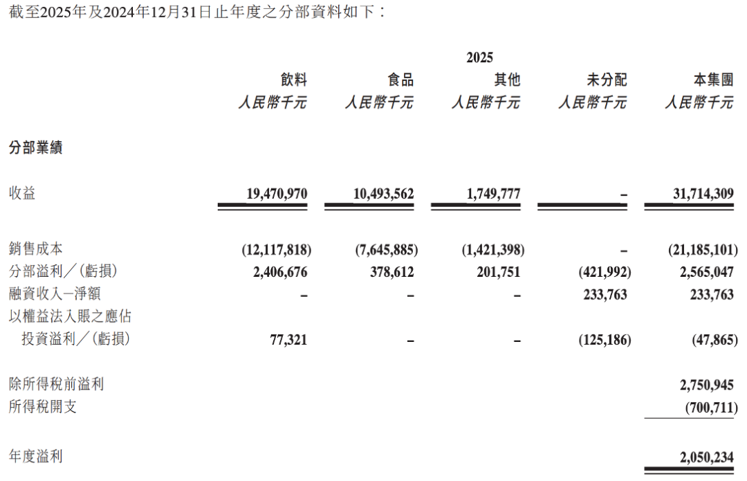 细分来看,饮料业务收入195亿元,较去年同期的192亿元略增,食品业务为105亿元,较去年同期的99.9亿元同样略增。