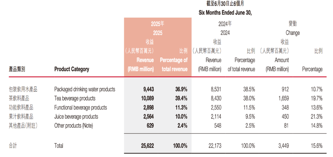 农夫山泉是最值得期待和警惕的巨头。2025年上半年,农夫山泉包装水销售94亿元同比增长10.7%,茶饮料达到101亿元同比增长19.7%,其中东方树叶作为百亿大单品,过去一年受到市场高度追捧。