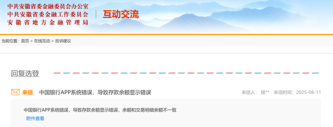 无独有偶,2025年8月,安徽程先生向安徽金融监管局反映,中国银行APP系统错误,导致存款余额与交易明细不一致。