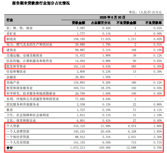 个人不良贷款超99亿元。2025中报显示,宁波银行对公不良贷款主要集中在造业、批发和零售业,不良贷款金额分别为12.11亿元、5.85亿元,不良贷款率分别为0.62%、0.36%,另外不良贷款金额在1亿元以上的企业包括建筑业、房地产业、租赁和商务服务业、科学研究、技术服务和地质勘察业,分别为1.68亿元、1.86亿元、1.62亿元、1.06亿元,不良贷款率分别为0.19%、0.12%、0.05%、0.4%。