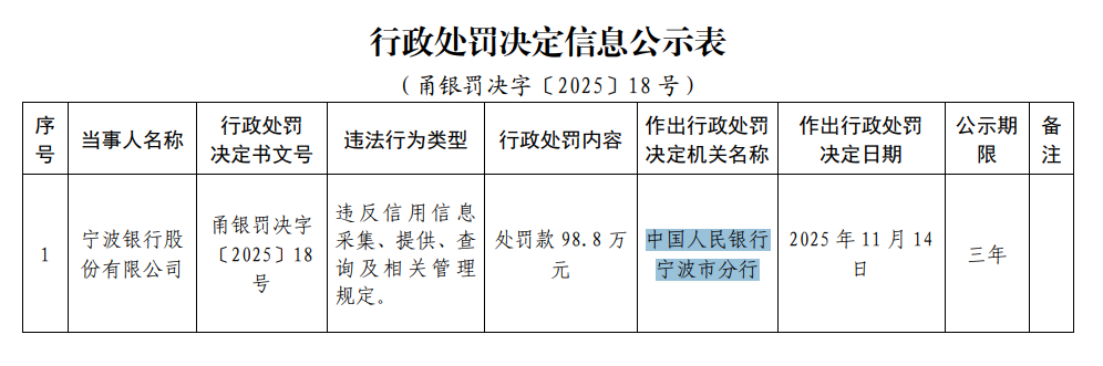 自身及子公司均遭罚。过去的一年,宁波银行及分行收到多张罚单,2025年11月,公司因违反信用信息采集、提供、查询及相关管理规定,被中国人民银行宁波市分行罚款98.8万元。