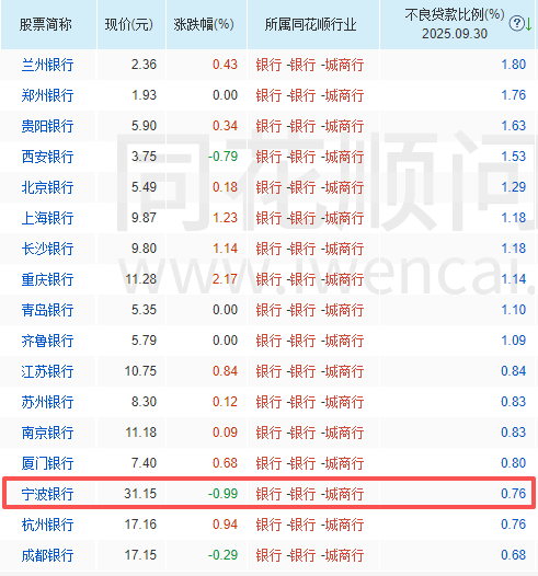 2025年前三季度,不良贷款进一步增加至129.95亿元,不良贷款率仍然为0.76%,在A股17家城商行中排在倒数第三,总体贷款质量稳定。