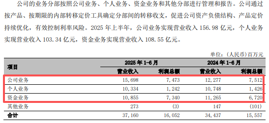 据短平快解读了解,利润总额下滑早在去年中报就有了苗头,2025年1-6月,宁波银行公司业务实现营业收入156.98亿元,同比增长27.87%%,利润总额为74.73亿元,同比微降0.52%;个人业务营业收入103.34亿元,同比下降3.85%,利润总额12.42亿元,同比下降12.9%;资金业务收入108.55亿元,同比下降3.64%,利润总额73.4亿元,同比增长9.23%。