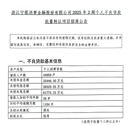 同月,浙江宁银消费金融股份有限公司(宁银消金)披露2025年第1期、2期个人不良贷款批量转让项目,未偿本息总额分别为6.19亿元、6.18亿元,加权平均逾期天数分别为1103天、1104天,均为损失。