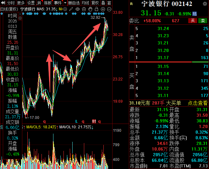 二级市场上,宁波银行表现总体表现尚可,从2024年9月17.15元/股(前复权,下同)的低点,波浪式上升至32.92元/股的高点,截至3月13日收盘,股价为31.15元/股,较低点涨幅约82%,较高点跌幅约5%,总市值2057亿元,TTM市盈率7.13倍。