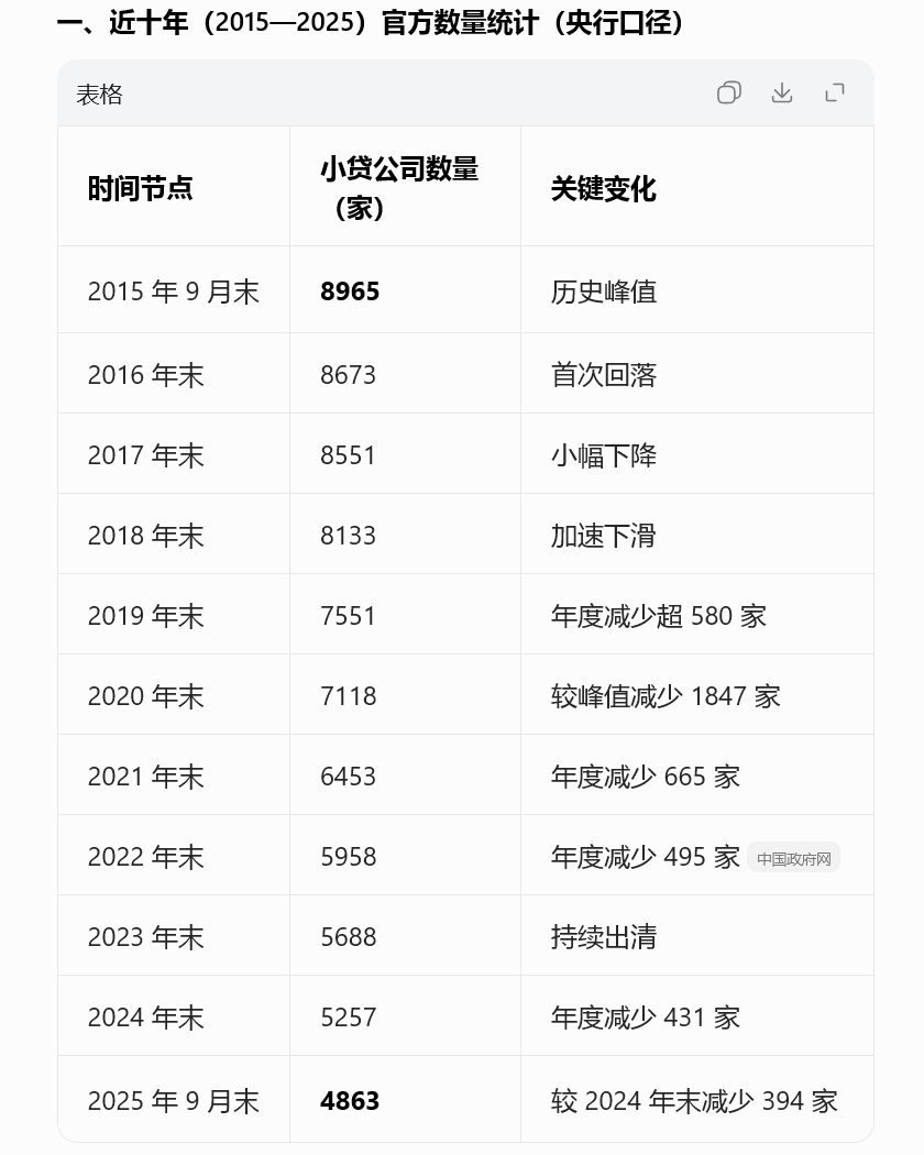 如标题,某全国性互联网小贷或将注销,但该小贷所背靠的集团还有消金牌照。本文虽未实名,但最终消息还需以官方为准,毕竟无论是企业端还是监管,决策都存在变数。过往岁月里,小贷牌照被玩烂了,牌照出租、高利放贷、超杠杆放贷、还......怎么形容这种感觉,有点像垃圾筐,什么都往里装。但“爸爸”展现出了极强的降存量的信号,且4倍LPR之后,这个牌照对于自营消金业务的价值更加有限。据AI统计,2025您9月末,小贷公司减少了4000余家。