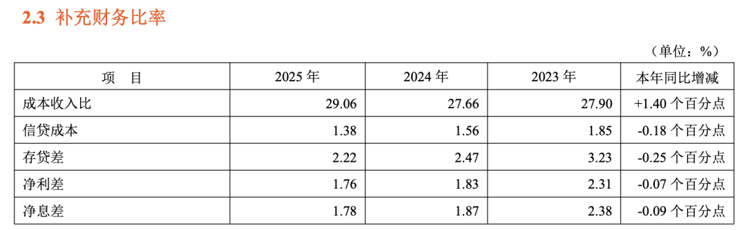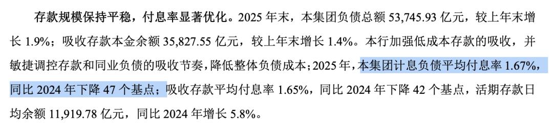 然而,更值得关注的是其负债成本的大幅优化,2025年,计息负债平均付息率1.67%,同比下降47个基点;其中,核心的存款成本优化尤为突出,吸收存款平均付息率1.65%,同比大幅下降42个基点。