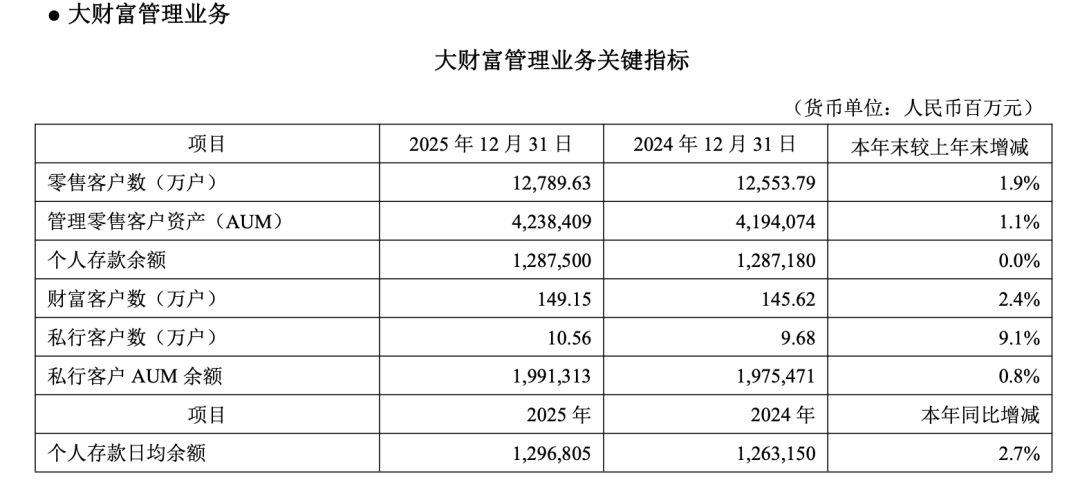 2025年末,管理零售客户资产(AUM)规模达4.24万亿元,保持稳健;而结构性亮点在于高端客群的深度经营。私人银行客户数达到10.56万户,较上年末强劲增长9.1%;私行客户AUM余额近2万亿元,保持稳定。