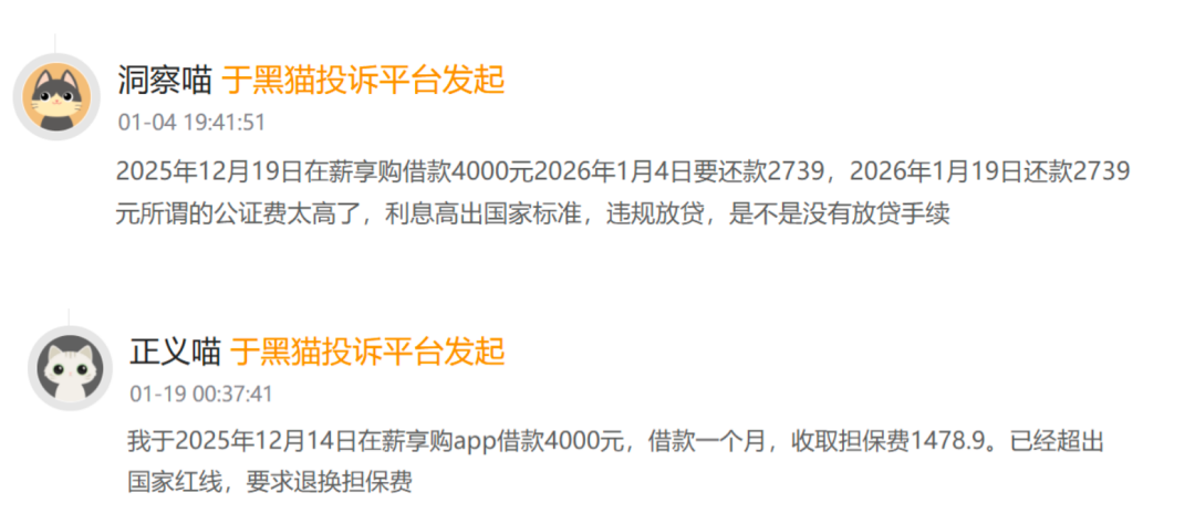 有用户表示,2025年12月19日在薪享购借款4000元,2026年1月4日要还款2739,2026年1月19日还款2739元。所谓的公证费太高了,利息高出国家标准。