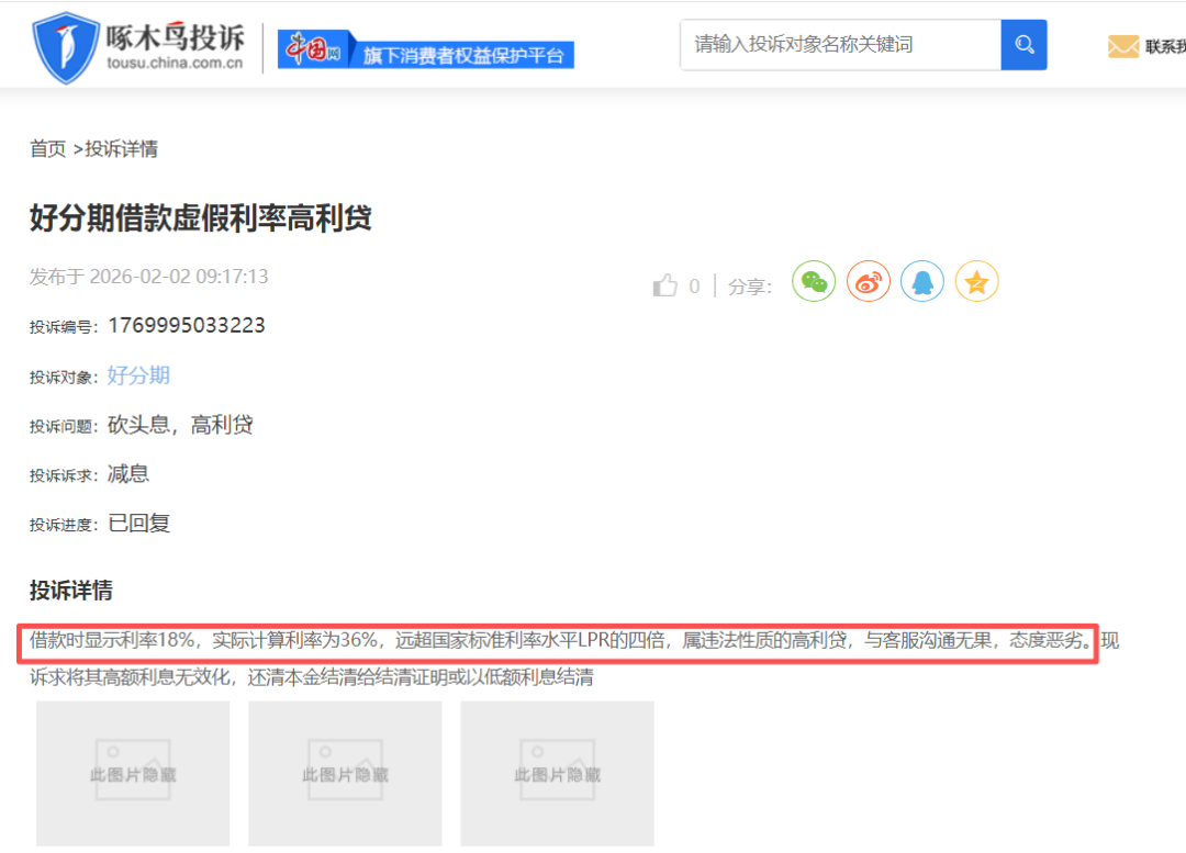 在啄木鸟投诉平台上,有用户反映在“好分期”平台借款时显示利率只有18%,但实际的利率算起来却高达36%,远超国家标准利率水平LPR的4倍,用户认为这就是“违法性质的高利贷”。