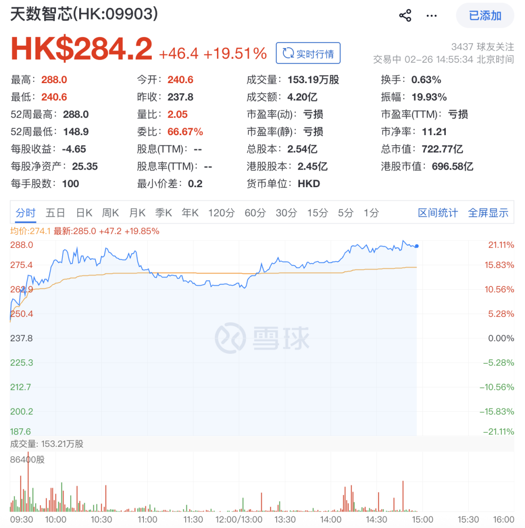 兆易创新涨3%,澜起科技、华虹半导体跟涨,但最扎眼的还是天数智芯——盘中一度涨超16%,收盘报277.0港元,把昨天那根阴线一口吞掉还带拐弯。