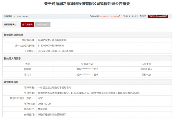 “男人的衣柜”海澜之家遭遇“重锤”。2月27日,军队采购网发布了一则处罚公告,称海澜之家因“中标后无正当理由拒不签订合同”而被暂停参加全军物资工程服务采购活动资格。