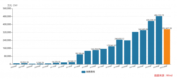 自2021年以来,海澜之家销售费用连增4年多,绝对值从2021年的32.52亿攀升至2024年的48.41亿元;2025年前三季度其销售费用已经达到35.24亿元,接近2021年全年。然而这些销售费用“收效甚微”,并未带来营收的增长,反而吞噬了大量利润。