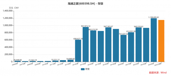 收入停滞不前、利润持续下降,海澜之家的库存状况却在恶化。2024年海澜之家存货创下历史新高,首次突破百亿大关,2025年三季度末仍然维持在115亿的高位。