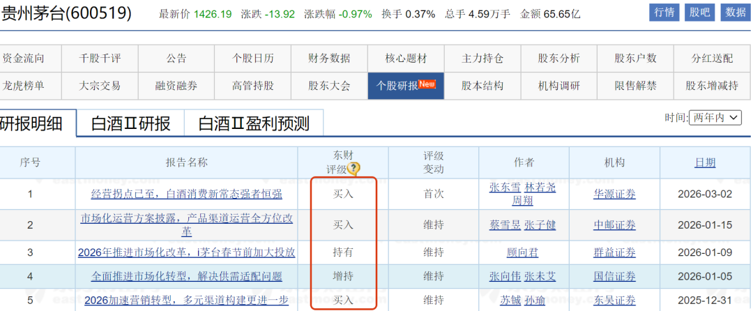 在茅台改革利好、以及段永平的加仓的消息面下,茅台股价开始反弹,2026年2月累计涨幅16%以上,市值一度逼近2万亿元,即便节后其股价出现一波连跌,机构却一致上调评级。可见市场对茅台依然有较强信心。