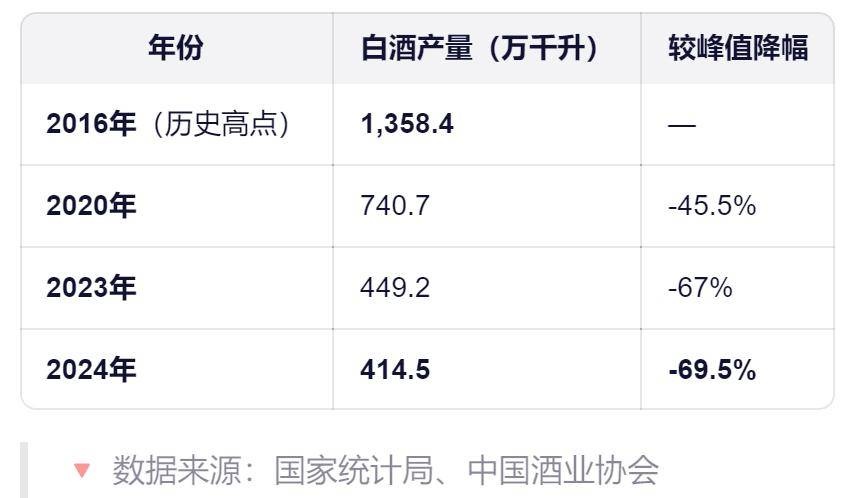 国内白酒市场几近饱和,产量已经连续多年下降,自2016年从历史最高点后一路下滑,2016年产量为1358.4万千升,2020年已经降至740.7万千升,几乎腰斩。截至2024年产量已经跌至414.5万千升,相比2016年的历史高点暴跌七成,这只用了不到十年。而2025年产量再跌至354.9万千升,等于相比2016年少生产了超1000万千升。