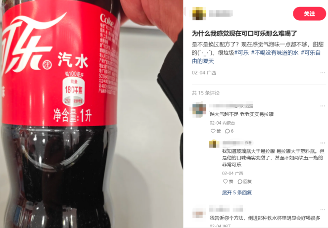 行业分析师李小敬表示,出于成本考量,可口可乐以玉米糖、果葡糖浆等性价比高的糖分,替换蔗糖等口感更好但价格更贵的糖分,可能导致口味“变淡”。叠加公司未及时跟进消费趋势变化而频频提价,使得用户下单冲动减弱。