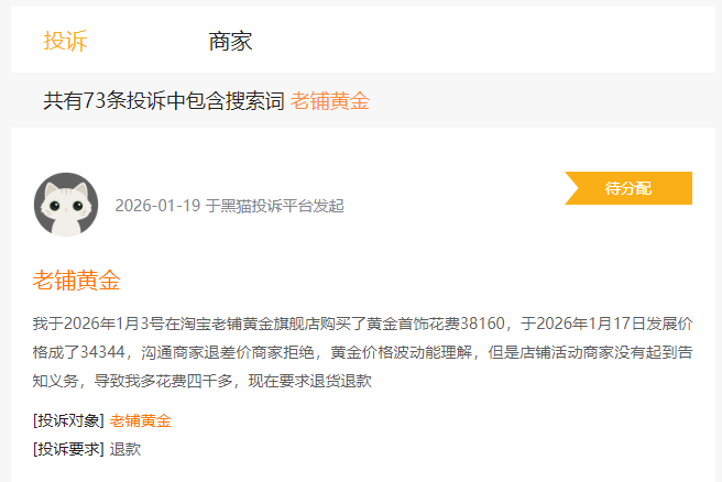 浏览黑猫投诉,截至2026年3月5日,共有77条投诉包含“老铺黄金”关键词。值得注意的是,老铺黄金官方并未入驻该平台,这意味着消费者声音并未直接触达品牌。