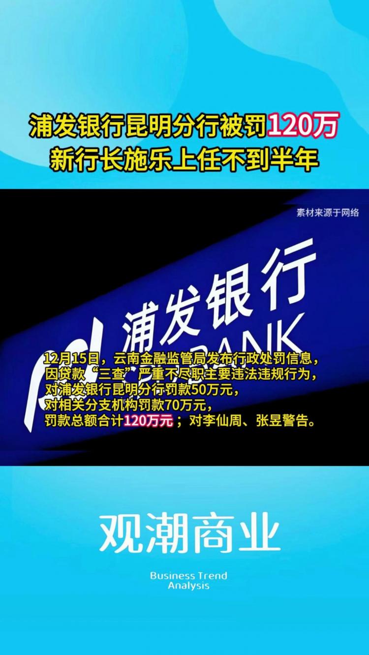浦发银行昆明分行被罚120万,昆明分行新行长施乐上任不到半年